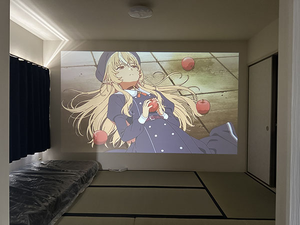 おまけで新居の白い壁にプロジェクターで映像を投影してみたところ。